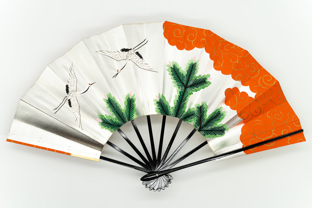 【ビンテージ品】上質な金箔地、銀箔地に若松と優雅に羽を広げて羽ばたく鶴が描かれています。日本では鶴は生命力と長寿の象徴、つがいと一生添い遂げることから夫婦円満の象徴でもあります。松は一年中青いため「永遠の命」の象徴で縁起がよいとされています。朱の雲どりに金の唐草模様がおめでたい雰囲気を添えており、お祝いの席にも最適です。地紙の色によってそれぞれ印象が異なり、お好みにより楽しんで頂けます。