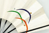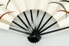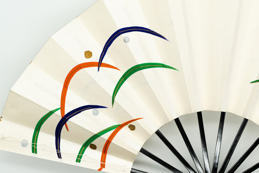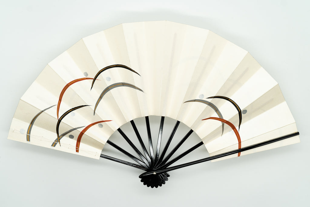 パール地の扇面に黒・グレー・茶の3色で露芝を表現しました。半円弧に描かれた芝草の上で露の雫が玉のように宿る様を描いています。