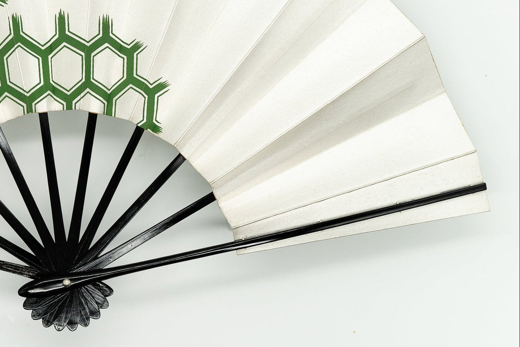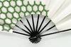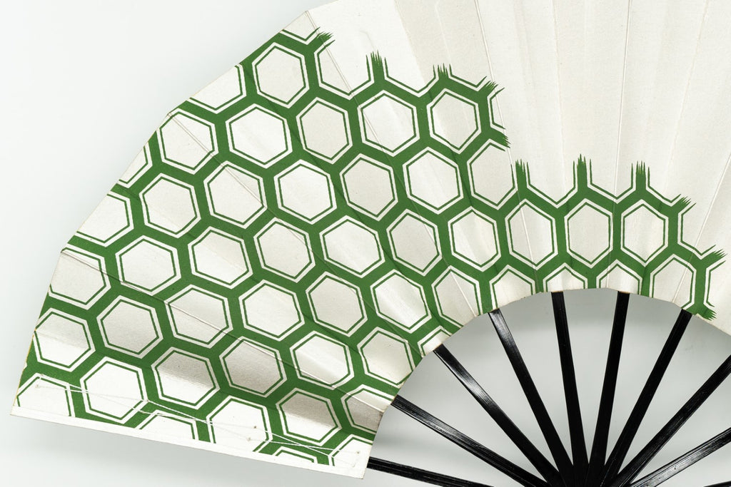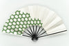 銀ハキ地に緑色の亀甲模様をあしらっています。亀の甲羅の六角形に由来する文様で日本では長寿吉兆の象徴「鶴亀」に結びつく事から古くから親しまれている吉祥文様の一つです。