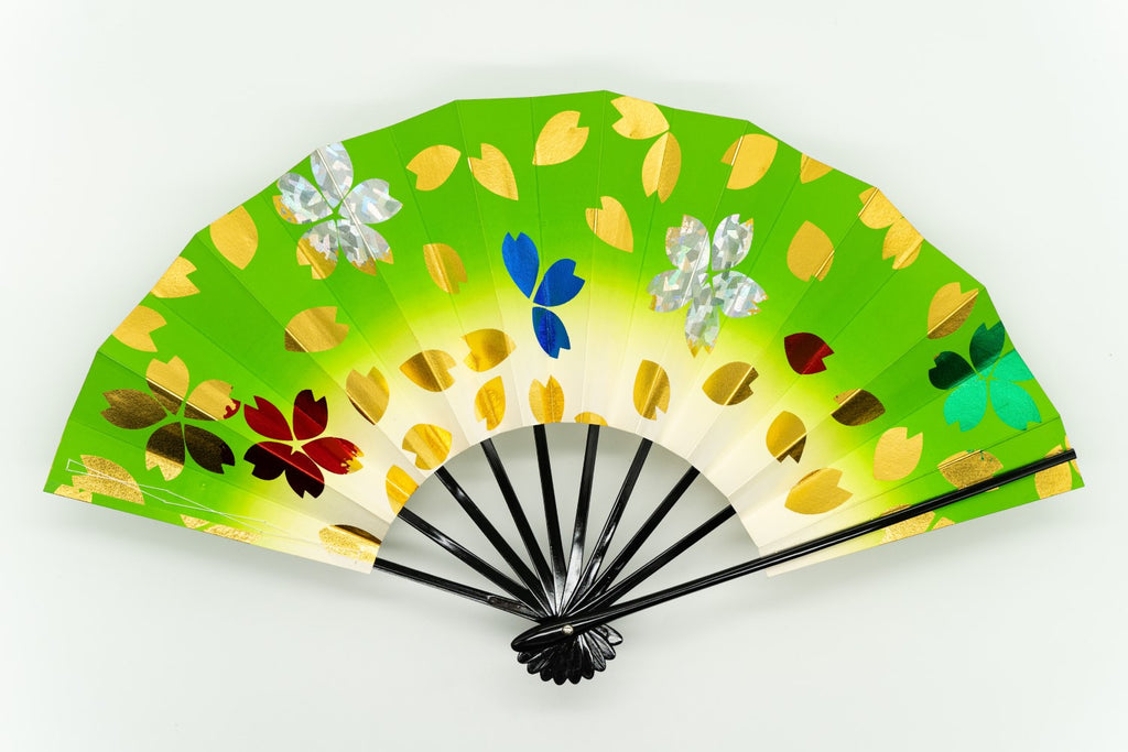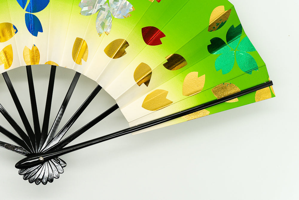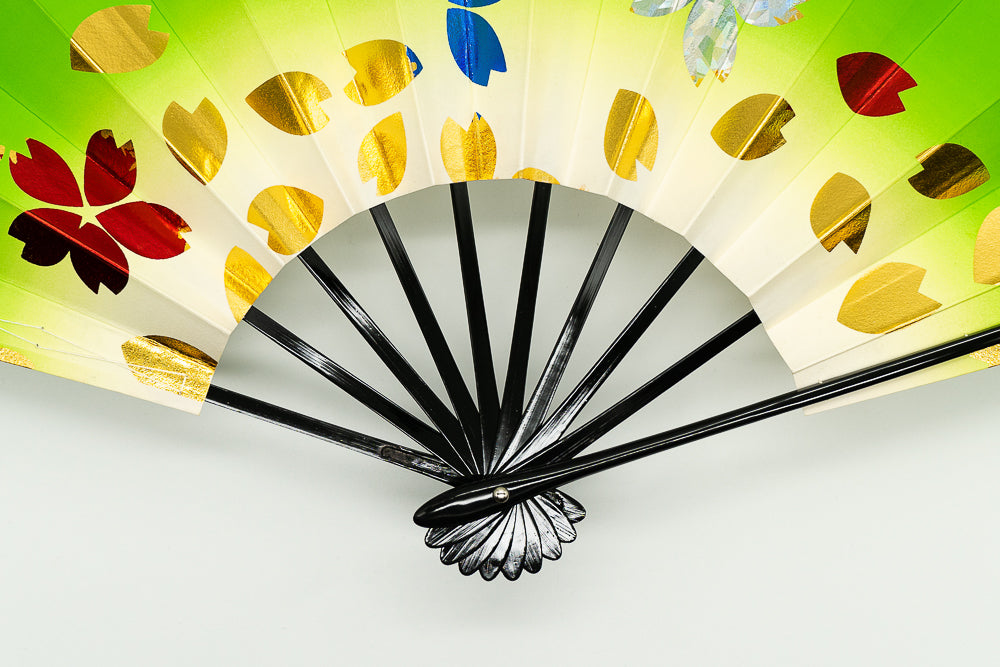 鮮やかな緑のぼかしにホログラムや金・赤・緑・青の色箔で桜を表現しました。華やかで明るく楽しいイメージに仕上がっており、写真映えもする一品です。