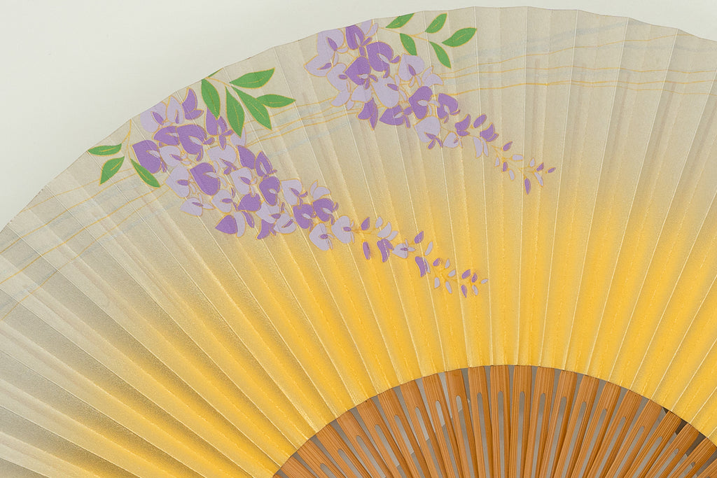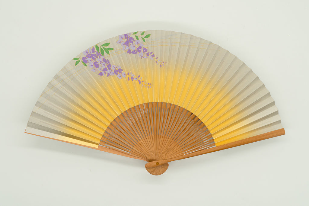 This elegant fan features a gold gradient adorned with soft wisteria blossoms swaying in the breeze, creating a soothing and harmonious design.