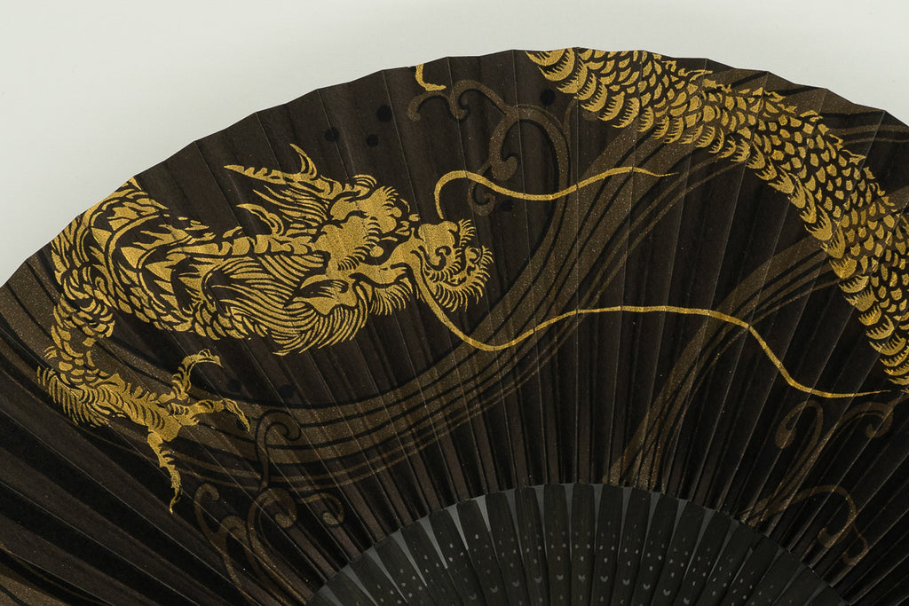 A golden dragon, manipulating the wind, leaps across the jet-black fan face. The silk-screened dragon, with each scale of its long body carefully printed, exudes an even greater presence.